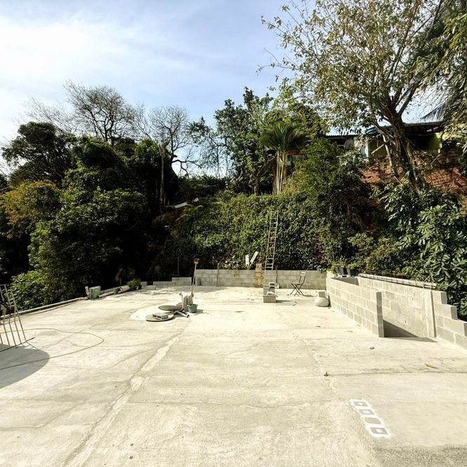 Outra escada leva ao terraço, que proporciona uma vista ampla da rua e da vegetação ao redor.